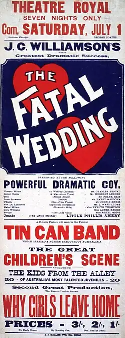 The Fatal Wedding is a play by Theodore Kremer and a 1911 Australian silent film directed by Raymond Longford based on the melodrama, which he and Lottie Lyell toured around Australia.[1] It was Longford's debut feature as director and one of the most popular Australian movies of its day. It is considered a lost film.