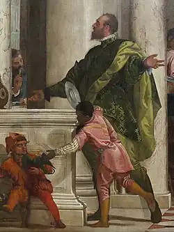 In the Renaissance, it was uncommon for patrons to give any specifications in regards to how a story or scene was portrayed by the artist.[8] There is evidence that compositions were often left solely up to the artist, as was stated in a painting treatise written in 1435 by Leon Battista Alberti.[8] This led to a situation where the artist alone would be judged for their choices.[8] Given that it was common practice for the artist to create their own composition with only a subject matter to guide them from the patron, the Holy Tribunal, unsurprisingly, put the artist Veronese on trial, and not the patron.[8] During the interrogation, Veronese was asked to explain why the painting contained "buffoons, drunken Germans, dwarfs and other such scurrilities" as well as extravagant costumes and settings, in what is indeed a fantasy version of a Venetian patrician feast.[9]