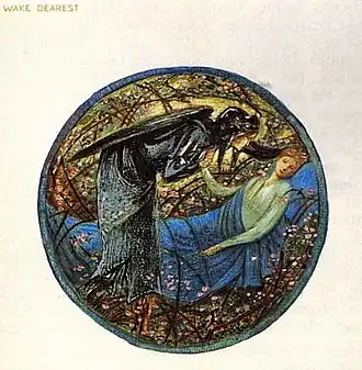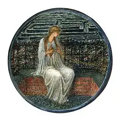 The Flower Book by the English artist Edward Burne-Jones (1833–1898) is a series of 38 round watercolours, each about six inches (15 centimetres) across, painted from 1882 to 1898. The paintings do not depict flowers; rather, they were inspired by the flowers' names. Burne-Jones called them "a series of illustrations to the Names of Flowers". "Not a single flower itself appears", according to his wife Georgiana.[1] They were painted for his private pleasure, many while he was resting at his summer home in Rottingdean, and were described by his wife as the "most soothing piece of work that he ever did".[1][2] In 1905 Georgiana, by then a widow, published a limited edition of high-quality colour facsimiles.