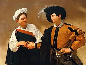 The composition focuses on a large table with different figures placed around it, crowding the image. The theme of the painting is the dangers that could be found in the streets of Rome at the time and includes various figures robbing each other. The subjects are depicted in a tavern with a table that looks like a fragment of architecture.[3] The table looks to be made out of marble and features an inscription of sorts on the front facing the viewer. It could be a fragment of the past Ancient Roman architecture of the area that has turned to a ruin. The soldier in the middle of the foreground splits the composition in two.[3] The right side shows a group of soldiers watching as one of the men gets his palm read. The woman on the left side is the fortune teller who is offering up her services for them. Fortune tellers were very successful during the 1610–20s in Rome and they have also been referred to as a zingara. [3] The man in the red hat is stealing the fortune teller's rooster while the little girl is stealing his bag of coins. This is a play on the cheater being cheated and the corruption of Rome.[3] The cheater being cheated is a reference to deceit, which was a common trait of both men and women during the early 17th century in Rome. It was common to steal things such as the items shown in the painting. Rome was a very dangerous place with drunkards, sword/knife fights, and murder.[3] These situations occurred in places like taverns, the streets, and even brothels.[3]
