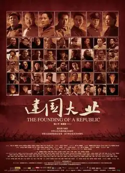 The Founding of a Republic is a Chinese historical drama produced in 2009 to mark the 60th anniversary of the People's Republic of China and was made to portray the final years of the Chinese Communist Revolution that followed the end of the Second Sino-Japanese War (1937-1945). This film was co-directed by Huang Jianxin and Han Sanping, and includes many famous actors such as Andy Lau, Ge You, as well as other directors such as Jiang Wen, and Chen Kaige. The main protagonists Mao Zedong and Chiang Kai-shek were played by highly renowned actors, Tang Guoqiang and Zhang Guoli. One of the purposes of this movie aside from reenacting the events of the Chinese Communist Revolution was to also attract a younger audience to view films that revolved around government propaganda, which they aim to accomplish by including famous actors that would draw the attention of the youth.[4] According to the executive at one of China's top multiplex chains, this film is also unique because the film unusually marries "the core of an 'ethically inspiring' film with commercial packaging.".[4] Additionally, this is the first zhuxuanlu (主旋律; i.e. propaganda) film to work solely with cinematic audio-visual methods to achieve its political and ideological goals. It is a milestone in that since its production in 2009, the distinction between zhuxuanlu and commercial film has become blurred; they have become primarily indistinguishable from each other.[5] This film was released on September 16, 2009, in mainland China and during its release, it had a tremendous amount of support from the Chinese Communist Party (CCP).