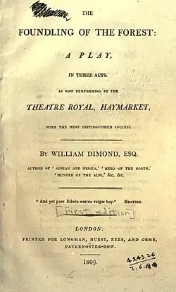 The Foundling of the Forest is an 1809 melodrama by the British writer William Dimond, also featuring music composed by Michael Kelly. It premiered at the Theatre Royal, Haymarket in London on 10 July 1809.[1] The original Haymarket cast included Charles Mayne Young as Count De Valmont, Richard Jones as Florian, Edmund John Eyre as Baron Loungeville, Charles Farley as Bertrand, John Liston as L'Eclair, Maria Gibbs as Geraldine, Sarah Liston as Rosabelle, Mary Ann Davenport as Monica and Julia Glover as Unknown Female. The Irish premiere was at the Crow Street Theatre in Dublin in December 1810.[2] It also appeared at the Park Theatre in New York City. Dimond dedicated the published version to Sophia Lee.