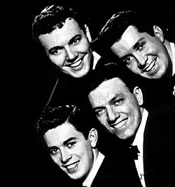 They did have two hit singles in the United States in the late 1950s, both on Paris Records.[1] The first, "Love Me Forever", featured orchestral backing by Sid Bass with vocal enhancement from a female session vocalist (Rosemary June), and peaked at No. 25 on the Billboard Hot 100 in 1957.[2] It also reached No. 23 on the UK Singles Chart.[3] In the US, Eydie Gormé's cover charted higher, whilst in the UK it was outsold by Marion Ryan's version.[1] The Four Esquires second hit, "Hideaway", had orchestral accompaniment by Richard Hayman, and peaked at No. 21 in the US in 1958.[2]