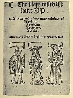 The Play called the foure PP; a newe and a very mery interlude of a palmer, a pardoner, a potycary, a pedler or The Four PP (pronounced "pees", plural of the name of the letter P) is an interlude by John Heywood written around 1530 that relates the tale of four men whose trades begin with the letter P. The characters in the play include two churchmen (a Pardoner and a Palmer), a medieval pharmacist (an aPothecary), and a Pedlar.[1] The play has no female characters. [2]