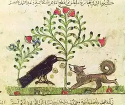 What seems to be a depiction of the tale on a painted vase discovered in excavations at Lothal from the Indus Valley Civilisation suggests that the story may have been known there at least a thousand years earlier than any other source.[10] In this scene, the bird is depicted perched on a tree holding a fish, while a fox-looking animal is underneath.[11]