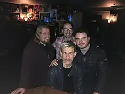 ![]() Left to Right: Hosts Ash Kernsworth, Craig Hazell and Tom Holmes. Front: Actor Dominic Monaghan in 2017 | |