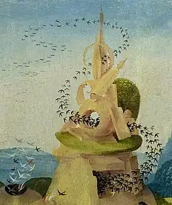 The focal point of the scene is the "Tree-Man," whose cavernous torso is supported by what could be contorted arms or rotting tree trunks. His head supports a disk populated by demons and victims parading around a huge set of bagpipes—often used as a dual sexual symbol[42]—reminiscent of human scrotum and penis. The tree-man's torso is formed from a broken eggshell, and the supporting trunk has thornlike branches which pierce the fragile body. A grey figure in a hood bearing an arrow jammed between his buttocks climbs a ladder into the tree-man's central cavity, where nude men sit in a tavern-like setting. The tree-man gazes outwards beyond the viewer, his conspiratorial expression a mix of wistfulness and resignation.[47] Belting proposed that the tree-man's face is a self-portrait, citing the figure's "expression of irony and the slightly sideways gaze [which would] then constitute the signature of an artist who claimed a bizarre pictorial world for his own personal imagination".[42] Many elements in the panel incorporate earlier iconographical conventions depicting hell. However, Bosch is innovative in that he describes hell not as a fantastical place but as a realistic world containing many elements from day-to-day human life.[43]