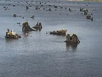Submerged oak tree stumps, high water