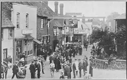 Also by this time, the former gallows had been converted into an inn sign that soon became a landmark,[19][31] and some structural and exterior alterations were made—the first of many over the subsequent years.[36] The earliest known photograph of the George, dated 1867, shows a dilapidated building of several uncoordinated parts: it had expanded over the years to take in buildings on each side of the original medieval inn, and it was considered a purely functional building with no obvious architectural merit.[37] By this time, the coaching era was in terminal decline because of the increasing popularity of rail travel; a line was opened between London and Brighton in 1841, with a station at Three Bridges just east of Crawley,[38] and the town centre received its own branch line and station in 1848.[39] Despite this, Crawley High Street remained busy as the town continued to grow, and The George underwent more renovation and was extended further. In particular, an old (possibly 18th-century) free-standing building which stood in the middle of the wide High Street, and which was once used as a candle factory, was acquired by the George's owners and became an annex.[40][41] It was this building, rather than the main part of the hotel, which accommodated Queen Victoria when she was forced to stay overnight.[34] Cycling for leisure purposes became a fad in the late 19th century, and the London–Brighton road was a popular route; the George became a regular stopping point for groups of cyclists.[42]