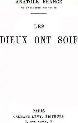 The Gods Are Athirst (French: Les dieux ont soif, also translated as The Gods Are Thirsty or The Gods Will Have Blood) is a 1912 novel by Anatole France. It is set in Paris in 1793–1794, closely tied to specific events of the French Revolution.