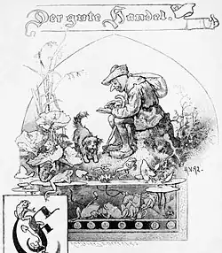 "The Good Bargain" (German: Der Gute Handel) is a German fairy tale collected by the Brothers Grimm, KHM 7. This antisemitic fairytale was added to the Grimms' collection Kinder- und Hausmärchen with the second edition of 1819. It is a tale of Aarne–Thompson type 1642.[1] A similar anti-Semitic tale collected by the Grimms' is The Jew Among Thorns (Der Jude im Dorn).