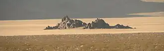 The Grandstand is located in the northwest corner of Racetrack Playa and is the only feature, other than small scattered rocks and a dolomite outcrop on the northernmost shore, that interrupt the playa. The southernmost of the two rock mounds that compose The Grandstand is the tallest, by a few feet. It rises approximately 20-metre (66 ft) above the very flat surface of the playa, whose north end is only 1.5-inch (3.8 cm) higher than the southern end. Racetrack Playa is at an elevation of 3,714 feet (1,132 m)[2] above sea level, and is 2.8-mile (4.5 km) long (north-south), and 1.3-mile (2.1 km) wide (east-west).