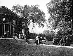 Originally, there was a path running up to the front steps, with an oval drive around the front lawn. The house stood on raised ground with terraces, as it does today. Around it was a mix of open spaces, stands of trees and flower gardens. Behind the house were vegetable and fruit gardens and, farther north, an orchard. The front lawn of The Grange, now known as the Grange Park, was central to Grange activities. This was the site for many garden parties, church school picnics and even a royal visit. The Grange itself is a terminating vista for John Street to the lake and the gardens would've reflected that.