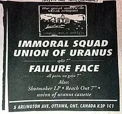 20. ^ "Record Reviews: Union of Uranus/Immoral Squad - split 7". HeartattaCk. No. 5. Feb 1995.