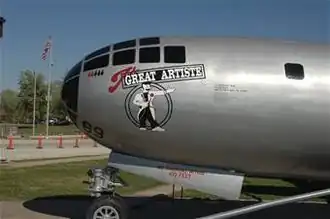 Built at the Glenn L. Martin Aircraft Plant at Omaha, Nebraska, The Great Artiste (B-29-40-MO 44-27353) was a Silverplate B-29 Superfortress bomber. It was accepted by the Army Air Forces on 20 April 1945, and flown to Wendover Army Air Field, Utah, by its assigned crew C-15, commanded by First Lieutenant Charles D. Albury, in May. It departed Wendover for North Field, Tinian on 22 June.[1]