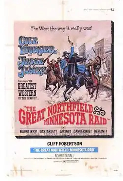 The Great Northfield, Minnesota Raid is a 1972 American Western film about the James-Younger Gang distributed by Universal Pictures. It was written and directed by Philip Kaufman in a cinéma vérité style and starring Cliff Robertson. The film purports to recreate the James-Younger Gang's most infamous escapade, the September 7, 1876, robbery of "the biggest bank west of the Mississippi", in Northfield, Minnesota.