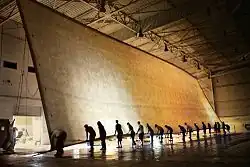 As of 2011, The Great Picture (111 feet (34 m) wide and 32 feet (9.8 m) high) holds the Guinness World Record for the largest print photograph, and the camera with which it was made holds a record for being the world's largest.[1] The photograph was taken in 2006 as part of the Legacy Project, a photographic compilation and record of the history of Marine Corps Air Station El Toro as it is being transformed into the Orange County Great Park. The project used the abandoned F-18 hangar #115 at the closed fighter base in Irvine, California, United States, as the world's largest pinhole camera. The aim was to make a black-and-white negative print of the Marine Corps air station with its control tower and runways, with the San Joaquin Hills in the background. The photograph was unveiled on July 12, 2006, during a reception held in the hangar and was exhibited for the first time at the Art Center College of Design in Pasadena, California, on September 6, 2007.[2][3]
