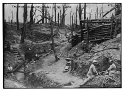The Finnish film director Dome Karukoski's 2019 biographical drama film Tolkien narrates Tolkien's early life and wartime experiences. It depicts him in delirium with trench fever on the front line,[39] beginning "to hallucinate scenes from the books he is yet to write",[40] and thus visually linking the war to his legendarium. In a vision, perhaps dreamed, in a smoky, dark and chaotic no man's land of mud and shattered tree-stumps, he sees not a Flammenwerfer but a fiery dragon before him.[38][39] He also has a batman named Sam.[38] Sheila O'Malley, reviewing the film for the film criticism website RogerEbert.com, comments that having Tolkien literally "see[ing] dragons and what would eventually become the Eye of Sauron and the Nazgûl, unfurling across the hellscape of No-man's-Land ... is a very reductive approach to literature". Worse, in O'Malley's view, is that by explicitly showing the Somme as "'inspiration'" (her quotation marks) for Middle-earth, the film "diminish[es] both the battle and the books".[1]