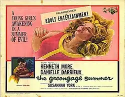 The Greengage Summer (called Loss of Innocence in the U.S.) is a 1961 British drama film directed by Lewis Gilbert and starring Kenneth More and Susannah York (in her first leading role). It was based on the novel The Greengage Summer (1958) by Rumer Godden. Set in Épernay, in the Champagne region of France, it is the story of the transition of a teenage girl into womanhood.