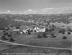 At the beginning of the 20th century, gold mining had petered out and Hearst began buying up property in the area. Over the next two decades, he amassed land holdings covering the entirety of four of the ten Mexican land grants and most of Jolon.[6] On top of the old Rancho Milpitas main ranch house site, at the edge of a small hill and about half a mile from and overlooking the old mission, Hearst hired Morgan to build a new ranch headquarters. Construction on the Mission Revival-styled building complex began in 1929, using poured concrete instead of adobe.[6] A smoothly domed north tower was built in Moorish Revival style above the main living quarters. Original plans for the building were for it to include housing for 20 employees but this was expanded to 30 during construction. A proposed southern wing for Hearst's private quarters was never completed.[6] Materials were carried from Santa Cruz in a Fageol truck. Construction costs totaled $200,000.[6]