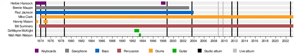 In 1973, the band comprised Hancock (keyboards), Bennie Maupin (saxophone, clarinet), Harvey Mason (drums), Paul Jackson (bass), and Bill Summers (percussion). Their first album, Head Hunters, sold more than one million copies.[2]
