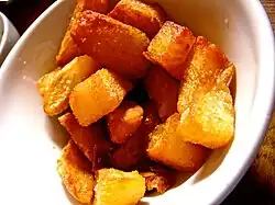 Rather than the molecular gastronomy at the Fat Duck, the Hind's Head serves British cuisine.[7] The menu features Blumenthal's interpretations of dishes such as oxtail and kidney pudding, tea-smoked salmon with sour cream butter and soda bread, and Blumenthal's triple-cooked chips.[15] Blumenthal said that the development of the cooking methods for the chips was his first foray into a scientific approach to cooking.[16] The former head chef Dominic Chapman worked with Blumenthal to develop a trifle for the dessert menu, which included multiple layers of syllabub, and both tea syrup and a green tea infusion.[17] The menu includes both a set menu and a selection of a la carte dishes.[3]