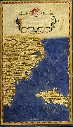 Richard Wylles (an English Catholic writer, b.1546 - 1577) another editor was active between 1558-1577 and co-edited the 1577 edition with Eden, penning a section entitled Of the Ilande Giapan, and other litle Iſles in the Eaſt Ocean through pages 251 - 260, thought to be one of the earliest accounts on Japan in English.[2] The account describes how Willes ascertained 'two hitherto unknown documents that contained descriptions of both China and Japan [with a] ... report on China [that] had come into his hands by way of a Portuguese merchant who had been captured and imprisoned by ... the Ming imperial court.' Wylles had 'acquired a handful of private letters about "the Japonish nation", written by the Jesuit monk, Padre Luis Frois. These letters had been written to fellow Jesuits and were not intended to be studied – still less published – by 'hereticke' Protestants.' The Jesuits had begun missionary work in 1550 under Francis Xavier in Japan and thus the name had become Latinized to 'Giapan' or more commonly as 'Iapon'.