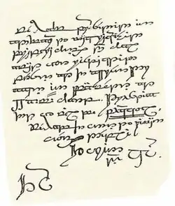 A page from Thorin's letter to Bilbo, detailing the contractual terms and conditions, handwritten in Tolkien's invented Tengwar script. The illustration is one of many in Rateliff's book that Tolkien had created to support his narrative.[3]