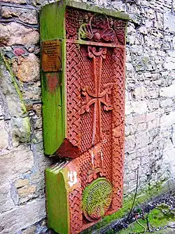 The school is unusual in having a Khatchkar in its grounds. A Khatchkar is a traditional carved cross which has been used in Armenia since the thirteenth century. The original Khatchkar was placed in the school by the Armenian government in thanks for the Lord Byron School which was built in Leninakan (now Gyumri) in Armenia following their 1988 earthquake at Spitak[5] and opened by Margaret Thatcher.[16] There was a good partnership between the schools largely due to the influence of the rector, Fred Green, from the local St Mary Magdalene church where Lord Byron is buried. The initial reason for the partnership arose because of Lord Byron. Byron was a famous British poet who had shown an affection for Armenian culture when he was a guest of the Mekhitarist Order in Saint Lazarus Island, Venice. The original Khatchkar was installed on 5 November 1991 in a ceremony attended by Kenneth Clarke the then Minister for education.[17] The original stone was irretrievably damaged by vandals in 2000. The Armenian government not only replaced it but also caused the original to be erected at the parish church.[5] The new stone by the original stonemason was installed in 2004 in memory of the rector and his belief that the damage should be seen as a strengthening of faith. It was thought that the original stone may have been damaged by football fans who confused Armenia with Albania.[16]
