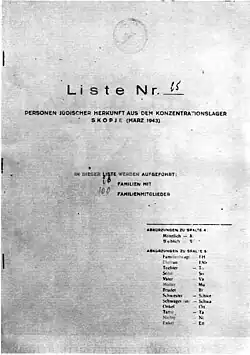 The Holocaust saw the mass murder of Macedonian Jews in World War II as a result of deportation organized by the governments of Kingdom of Bulgaria and Nazi Germany, with the aim of systematically eliminating the Jewish population from the so-called "newly liberated territories" by the Bulgarian authorities. The deportation of Jews from Macedonia was part of the deportation of Jews from all the territories occupied by Bulgaria (Vardar Macedonia and Pomoravie (Kingdom of Yugoslavia) and Belomorie (Kingdom of Greece)).[1] All Jews from Macedonia were deported to the Treblinka extermination camp in occupied-Poland, where they were suffocated in gas chambers. Not a single witness survived to recount the horrors of the destruction of the Jewish population of Macedonia. Documents are the only witnesses to prove the fate of the Jews in Macedonia.[2][3]