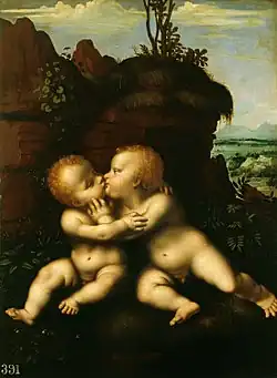 The connection between those paintings is evident in two copies made by Marco d'Oggiono (one of them - the Thuelin Madonna) and copy made by Bernardino dei Conti (lost during World War II). Madonna, very much like as the one depicted in Virgin of the Rocks is seen blessing two kissing children, representing Jesus and St John the Baptist. Other copies show half-length figure of Madonna leaning over the table with figures of embracing children (like copy by school of Leonardo da Vinci held at Burchill Collection, Milan, and a copy ascribed either to Marco d'Oggiono or Giampietrino). The painting of Holy Family (including holy infants embracing) by Bernardino Luini held at Prado, Madrid shows a similar representation. Most of the copies show only the group of two children in a quite different background. These include copies by Marco d'Oggiono, depicting holy children in a background of castle (Milan), grotto, rocky landscape (Windsor collection). The subject of two children kissing was repeated many times by another Leonardo follower, Joos van Cleve, who was called Leonardo des Nordens or "Leonardo of the North":
