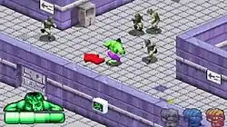 The Incredible Hulk is a free-roaming isometric beat 'em up game in which the player controls the Hulk and guides him through a series of 33 levels.[1] The Hulk can move in eight directions, and his default movement can be toggled between diagonal and horizontal in the options menu. The Hulk can also jump, pick up and throw objects, and use an assortment of physical attacks to destroy enemies and cause damage to the environment.[2] Some levels require the Hulk to locate and destroy generators to deactivate environmental hazards that block a path through the level, and many areas contain hidden paths that can be uncovered by breaking cracked walls.[3]