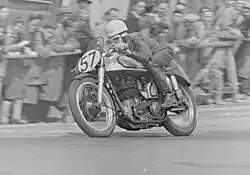 After his win in the 1949 Isle of Man Clubman event, Geoff Duke entered the 1950 Isle of Man TT only to find himself racing against formidable opposition in his first Senior TT, not only from his experienced Norton team mates, Artie Bell, Harold Daniell and Johnny Lockett, but also Les Graham on an AJS Porcupine, Reg Armstrong and Bob Foster on Velocettes. Geoff was wearing a new set of one-piece leathers and he beat them all, breaking both lap and race records in the Senior, and finishing second in the Junior TT. It was the beginning of a spectacular racing career for Geoff Duke.[2]