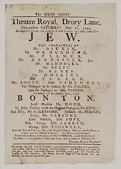 The Jew is a comedy written by playwright Richard Cumberland and first presented at the Theatre Royal, Drury Lane in London on 8 May 1794. The play is notable as the first play in the English theatre to portray a Jewish moneylender as the hero of a stage production.