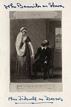 The anti-Jewish tradition on the English stage dates back at least to the expulsion of the Jews from England in 1290 and is exemplified by the characters of Shylock in William Shakespeare's The Merchant of Venice and Barabas in Christopher Marlowe's The Jew of Malta. In a series of articles called Observer, first published in 1785, Cumberland created a character named Abraham Abrahams who would later serve as a template for Sheva, the title character in The Jew. In one instalment of Observer, Abrahams is quoted as saying, "I verily believe the odious character of Shylock has brought little less persecution upon us, poor scattered sons of Abraham, than the Inquisition itself."[1] A decade later, in writing The Jew, Cumberland sought to create a positive image of a Jewish man that would counteract centuries of anti-Semitic portraits. The tremendous success of the initial production prompted Cumberland to later write, "The benevolence of the audience assisted me in rescuing a forlorn and persecuted character, which till then had only been brought upon the stage for the unmanly purpose of being made a spectacle of contempt, and a butt for ridicule. In the success of this comedy I felt of course a greater gratification, than I had ever felt upon a like occasion."[2]