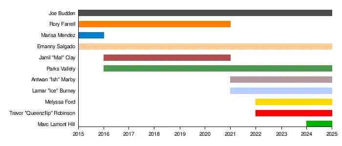 Later in May 2021, two of Budden's long-time friends, Antwan "Ish" Marby and Lamar "Ice" Burney joined the podcast as co-hosts.[12] In December 2022, media personality and former video vixen Melyssa Ford and social media entertainer Trevor "Queenzflip" Robinson also joined the podcast as co-hosts.[13][14]