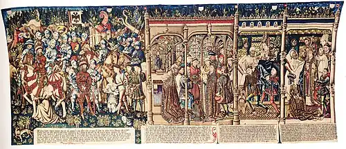 Each panel was about eleven feet in height, and together they spanned a distance of about thirty-five feet. The theme of the panels was justice safeguarded by divine intervention.[5] The legends of Trajan and Herkinbald appear to occur together for the first time in 1308 in the Alphabetum Narrationum (Alphabet of Tales), a collection of over 800 tales attributed to Arnold of Liége (previously to Etienne de Besançon) arranged by themes and intended to be used as a basis for homilies. The theme Iustitia (Justice) included just these two legends, although the legend of Trajan is given in a slightly different version from that depicted in the paintings and tapestry.[6]
