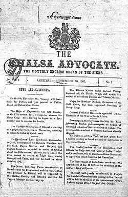 The Khalsa Advocate was a Sikh newspaper in English founded in 1903 by the Chief Khalsa Diwan.[1][2][3] It was one of the most prominent and influential Sikh periodicals prior to 1920.[4][5]