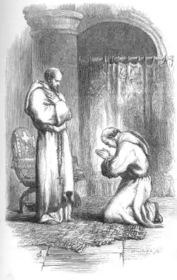 The abbot is quickly recaptured, thanks largely to Demdike. Shortly before the time for the death sentence to be carried out the following morning, the appointed executioner and his assistants disappear, because, it is suggested, they are reluctant to put churchmen to death. Demdike offers to take the executioner's place, and his offer is accepted. Moments before the appointed time, Demdike whispers to the abbot that he can spare him the indignity of a public execution by stabbing him to death if he would but retract the curse he had put on his daughter. The abbot's response is "Never ... thy child shall be a witch, and the mother of witches".[11] Following his execution the abbot's body is entrusted to Demdike to be taken to the convent church. One of the abbot's erstwhile rescuers, Hal o' Nabs, has been warned that Demdike is impervious to all weapons forged by man, and so to wreak his revenge for the death of the abbot he secretes himself behind a great stone statue of St Gregory in the gallery of the church, waiting for Demdike to appear below it. When he does, Hal pushes the statue from its pedestal and it falls on Demdike, crushing him and killing him instantly.