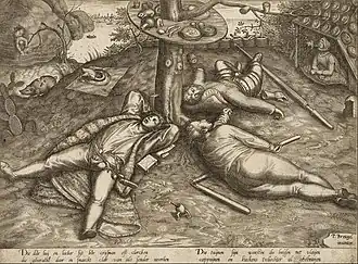 Het Luilekkerland (Dutch, "Cockaigne", literally "The Lazy-Tasty Land"[1]) – known in English as The Land of Cockaigne – is a 1567 oil painting by the Netherlandish Renaissance artist Pieter Bruegel the Elder (c. 1525–1569). In medieval times, Cockaigne was a mythical land of plenty, but Bruegel's depiction of Cockaigne and its residents is not meant to be a flattering one. He chooses rather a comic illustration of the spiritual emptiness believed to derive from gluttony and sloth, two of the seven deadly sins.[2]