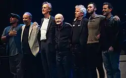 In September 2021, the three dates in Ireland and Northern Ireland were postponed indefinitely due to the pandemic.[43] On 8 October, the last four dates of the UK leg were postponed after Rutherford tested positive for COVID-19.[44] The three London shows were rescheduled for 24–26 March 2022.[45][10] Due to demand, Genesis announced an extra date for 11 December 2021 at the Barclays Center in New York City, however, the show was later cancelled, with the official reason given at the time being "unforeseen circumstances", however, multiple sources later told Billboard that technical difficulties with the venue's then-ticketing outlet, SeatGeek, and lower than expected tickets sales were the reason for the cancelation, which were cited as a reason for the venue ending their partnership with SeatGeek earlier than expected.[46][47] On 25 October 2021, Genesis announced a European leg covering Germany, France, and the Netherlands between 7–22 March 2022. Those shows were followed by the three rescheduled dates in London, bringing the total number of shows to 47.[48] The final show, held on 26 March 2022, marked the 46th anniversary of the first Genesis concert with Collins as lead vocalist, which took place in London, Ontario in 1976. (This date was also coincidentally the 13th anniversary of the passing of former Genesis drummer John Mayhew.[49]) Gabriel and Genesis' former tour manager Richard Macphail were present backstage.[50]