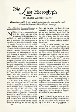 ![]() Title page of "The Last Hieroglyph" as it appeared in Weird Tales, April 1935. | |