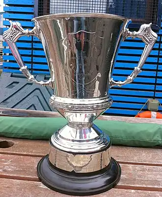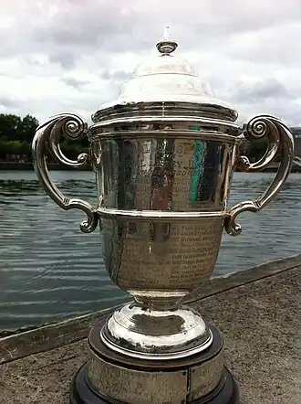 The Cup presented to the winner of the men's Liffey Swim race is called the Irish Independent Cup. It was presented to the Leinster Branch of the Irish Amateur Swimming Association by Independent Newspapers Ltd in 1921. The exact inscription on the front of the cup is "Challenge Cup for Annual Liffey Race (Inaugurated 1920) Presented to the Leinster Branch Irish Amateur Swimming Association by the Irish Independent". The trophy was made by Hopkins & Hopkins, Silversmiths (Markers mark: H&H), located near O'Connell Street Bridge, Dublin, at a cost of 50 guineas [£52-10-0]. The Cup bears the Dublin Assay Office hallmarks and date letter for 1921 (Britannia, Harp with Crown, Letter F). The names of all winners from 1920 J.J. Kennedy through 2004 Robert Clarke are engraved on the Cup. The winners from 2005 onwards are on its base. Although the cup was not presented until 1921, the winner that year, John Cyril Hopkins, insisted that the name of the winner of the inaugural Liffey Swim in 1920 J.J. Kennedy be placed on the trophy before his.[1]