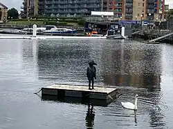 A sculpture of a child wearing a bird costume, standing on a pontoon.[22] |