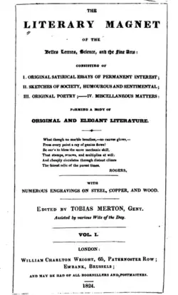 The Literary Magnet was a British magazine.[1] Started as a weekly magazine in 1824 by Egerton Brydges and his son using the pseudonym Tobias Merton, it became a monthly magazine towards the end of 1824. The Magnet went through a number of editors, and was bought first by Alaric Alexander Watts in late 1825, and then William Charlton Wright in 1828. Its primary emphasis shifted from prose to poetry under Watts, who managed to get contributions from several notable poets of the day.[2]