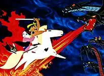 The film was distributed in the United States, under the title The Little Prince and the Eight-Headed Dragon, as a matinee feature by Columbia Pictures, opening January 1, 1964.[9] Its Japanese origin was downplayed, as was standard practice at the time,[10] with William Ross, the director of the English dubbing, credited as director and Fujifilm and Toei's color and widescreen processes rebranded as "MagiColor" and "WonderScope" respectively.[5] The English-dubbed version was also released under several other titles, including Prince in Wonderland and Rainbow Bridge.[11] The film's plot is based on the Shintō myth of the storm god Susanoo's battle with the Yamata no Orochi.