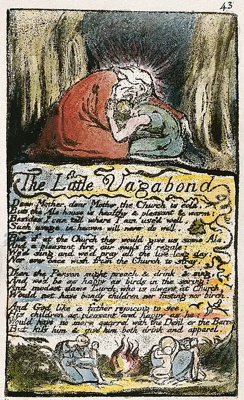 "The Little Vagabond" is a 1794 poem by English poet William Blake in his collection Songs of Innocence and of Experience. His collection, Songs of Innocence, was originally published alone, in 1789. The scholar Robert Gleckner says that the poem is a form of transformation of the boy in the poem "The School Boy", from Songs of Innocence.[2]