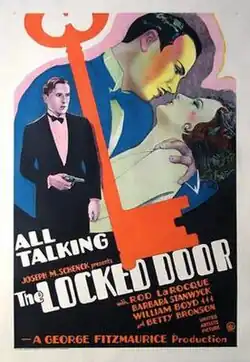 The Locked Door is a 1929 American pre-Code drama film directed by George Fitzmaurice, and starring Rod LaRocque, Barbara Stanwyck, William "Stage" Boyd and Betty Bronson. It is based on the 1919 play The Sign on the Door by Channing Pollock.[1][2] The play was first adapted for the screen in 1921 as The Sign on the Door, starring Norma Talmadge.[3] It was Stanwyck's first starring role and first talking film.