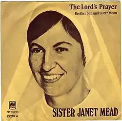 In the United States, "The Lord's Prayer" was picked up for American distribution by A&M Records (catalogue number 1491, b/w "Brother Sun and Sister Moon").[3] It was certified gold for sales of one million copies.[3][4] The single entered the Billboard Hot 100 chart on 23 February 1974, charted for 13 weeks and reached a peak of No. 4 during Holy Week in April. The record also reached No. 2 on the Adult Contemporary singles chart.[5] It made Mead the first Roman Catholic nun to have a hit record in the United States since Jeanine Deckers ("The Singing Nun"), hit No. 1 with "Dominique" in late 1963.[3] It also became the only song to hit the Top 10 in which the entire lyrical content originated from the words of the Bible. More specifically, it is the only Top 10 hit with words attributed to Jesus Christ.