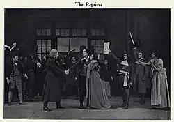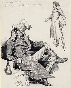 Martin-Harvey also recalled that to emphasise the cruelty of Dubosc Irving hummed some bars of La Marseillaise while searching the dead body of the courier, on another night shocking the audience by instead humming 'Nearer, My God, to Thee'. 'The effect was appalling,' Martin-Harvey said. '[In the finale] it is hardly possible to exaggerate the savagery of Irving's performance in that scene, yet never did he overstep the truth of nature and degenerate into extravagance. Dubosc though a monster was a credible human being and it was that fact that gave the play its lasting popularity'.[9]